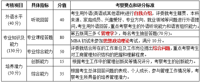 答:复试环节包括政治理论测试、外语水平测试、专业知识及能力测试与管理创新能力测试,复试面试评分标准详见下表: