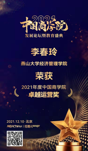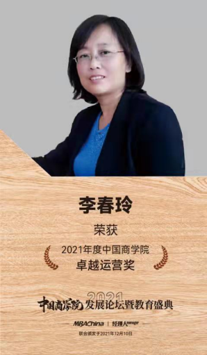 MBA项目荣获“2021年度中国商学院特色MBA项目奖”、“2021年度中国商学院最佳产教融合实践奖”,李春玲院长荣获“2021年度中国商学院卓越运营奖”。