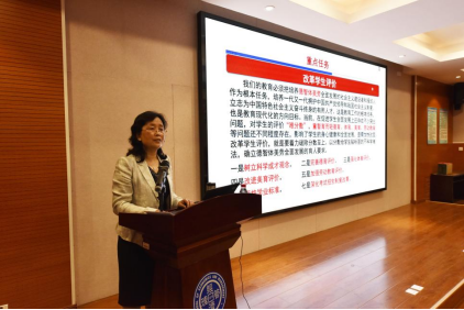 院长李春玲结合当前社会热点,阐述了《总体方案》出台的背景意义、基本定位和原则,以及深化新时代教育评价改革的目标和重点任务。要坚持以立德树人为主线,以破“五唯”为导向,以五类主体为抓手,着力做到政策系统集成、举措破立结合、改革协同推进。李春玲院长详细解读了五“破”五“立”的新时代教育评价改革五方面重点任务,要求全体教职工潜心教学、全心育人,坚持把师德师风作为第一标准、突出教育教学实绩、强化一线学生工作、改进高校教师科研评价、推进人才称号回归学术性、荣誉性;坚持德智体美劳全面发展的育人要求,树立科学成才观念、完善德育评价、强化体育评价、改进美育评价、加强劳动教育评价、严格学业标准、深化考试招生制度改革。