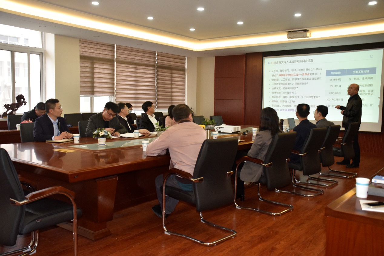 的基本情况进行了介绍。副院长靖鲲鹏从一流专业建设与专业评估工作开展情况、结合新文科人才培养方案的制定情况、超级金课群建设、课程思政和降低班容量工作计划、一流课程建设规划、创新创业教育开展情况以及对教学激励政策措施的建议等方面,对学院教学工作开展情况进行了汇报。各专业及实验中心负责人结合本专业实际情况,介绍了教学工作的开展情况以及遇到的问题和面临的挑战。教务处(教师教学发展中心)、创新创业教育与指导中心相关领导针对各专业的提出的问题和困惑进行了详细的解答,并同与会人员进行了深入交流和探讨。