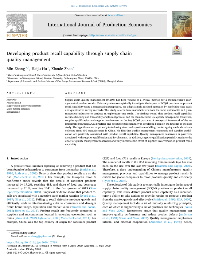 工业工程系副教授胡海菊与英国贝尔法斯特女王大学张旻教授、中欧国际工商学院赵先德教授合作的题为《Developing product recall capability through supply chain quality management》的研究成果发表在运营管理领域国际顶级期刊《International Journal of Production Economics》。这篇论文是在胡海菊老师的国家自然基金项目《组织合法性视角下产品伤害危机应对策略的选择及影响机理研究》的资助下完成,论文以采用案例研究和问卷调查两种方法研究了供应链质量管理实践队企业产品召回能力的影响。
