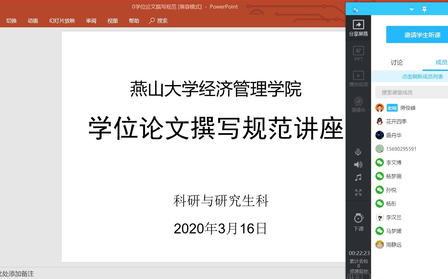 为进一步提高学位论文撰写规范,学院科研与研究生科利用腾讯课堂平台开设了撰写规范线上辅导讲座,讲座结合案例和常见问题,分学术型和专业型对学位论文撰写规范要求进行了详细解读并对后续工作安排进行了说明,近200名研究生通过在线或回看方式参与辅导交流。