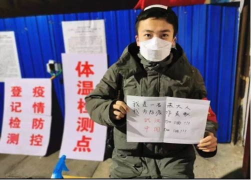 2018级工合3班刘泽宇参与了河北省唐山市本地的抗疫防疫的志愿服务活动,主要负责来往人员检查与体温检测。他为武汉和中国送来美好的祝愿:大爱无界,共克时艰,春日已来,万物更生,相信中国,加油武汉!