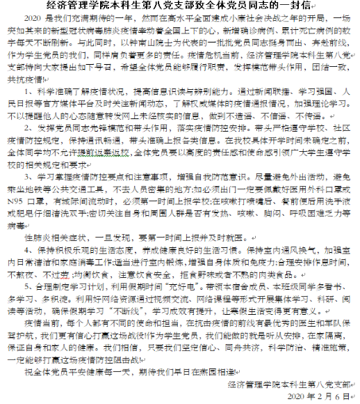 本科生第八党支部致信全体党员,号召学生党员担当使命,履行职责,发挥先锋模范作用,团结抗疫。