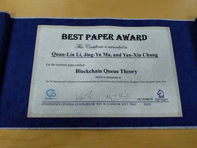 李泉林教授的研究团队依据区块链数学模型的学术论文“Blockchain Queue Theory”获得唯一的最佳论文奖。该论文从2018年8月arXiv.org在线发表以来受到了国内外许多学者的好评与重视,它意味着区块链的重要基础性科学问题可以利用排队论、马氏过程与马氏决策过程等随机运筹学理论方法来研究与解决。