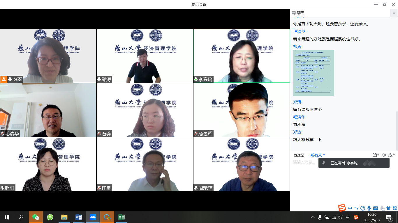 组织进行了混合式教学创新设计大赛院赛暨混合式教学交流会于5月27日,腾讯会议线上召开。此次比赛由院长李春玲教授担任组长,周荣辅、毛清华、郑涛、宓翠四位老师组成评审小组。来自工商、会计、工业工程和经济系的四名选手对开展混合式教学的课程进行了展示和分享。