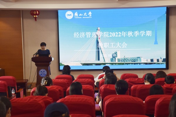 在经管楼A218报告厅召开2022年秋季学期全体教职工大会,学院领导班子成员、全院教职工参加了会议。大会由正处级专职辅导员、工会主席刘琳主持。