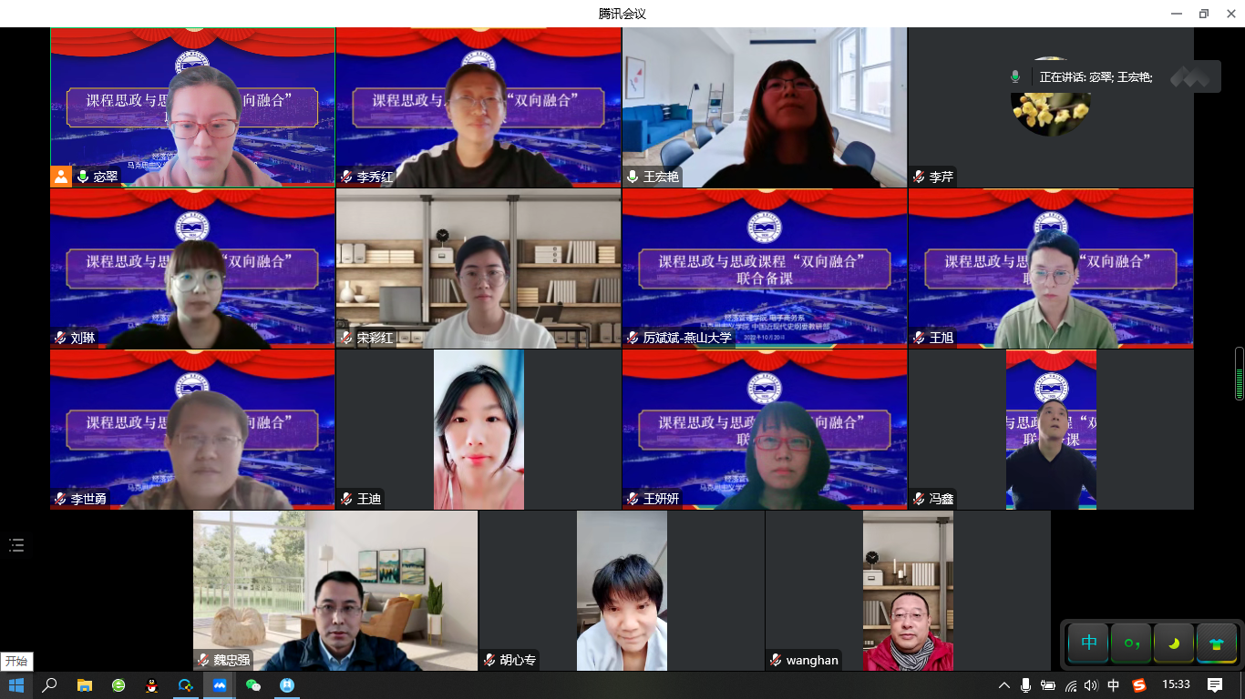 广大教师进一步强化育人意识,找准育人角度,提升育人能力,构建全员、全过程、全方位育人的“大思政”格局, 10月20日下午,学院联合马克思主义学院开展课程思政与思政课程“双向融合”联合备课教研活动。根据疫情防控要求,本次活动采取线上形式开展,活动由学院6个基层教学组织邀请马克思主义学院骨干教师分别开展,每组邀请一名处级领导参加,教务处副处长赵春梅、马克思主义学院书记王新华、副院长刘永志、图书馆馆长袁旭梅、哔咔漫画