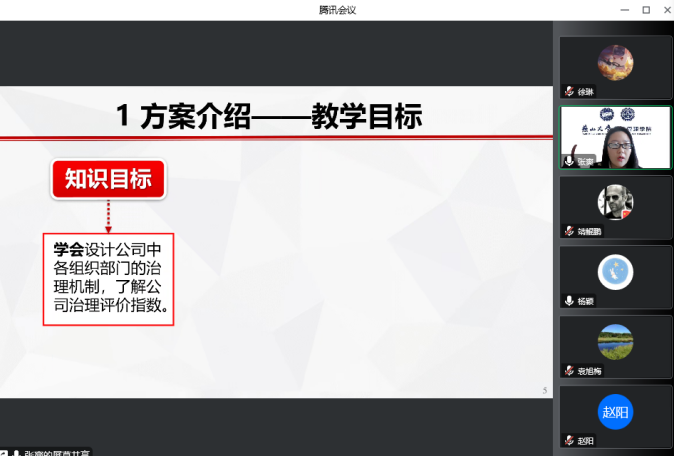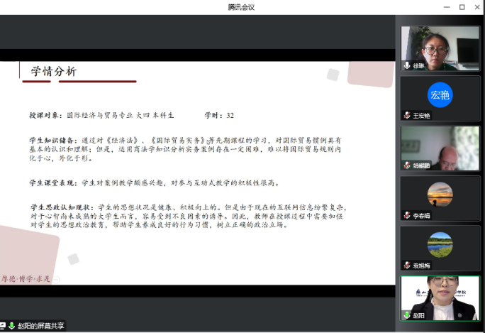 经各系、中心推荐,本次竞赛共有3位教师参赛,参赛教师准备充分、教学风格各具特色、内容整合到位,以说课和讲课的方式充分展示了各自独特的教学风采和课程思政功底。参赛教师分别以《创业与企业管理》《国际商法B(三级项目)》和《公司治理》课程为例,依据课程特点,在整个教学环节中巧妙地融入家国情怀、社会责任、文化自信、职业素养等思想政治教育元素,将其作为知识点的部分内容或实践方法,真正做到润物细无声,并充分发挥思政元素的教育价值,完美展现了知识传授和价值引领相统一、教书和育人相统一、潜心治学和心怀家国相统一。