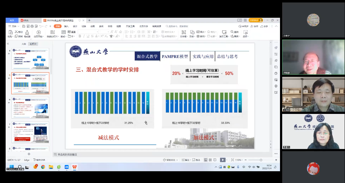 线上线下混合式教学方法改革,引导、激励教师基于在线课程采用多元化教学模式开展教学,提升课程教学质量,根据学校统一部署,2022年11月4日,学院邀请理学院副院长王明利教授分享线上线下混合式教学的优秀经验,本次培训会通过腾讯会议的形式开展,学院全体教师参加,培训会由副院长靖鲲鹏主持。