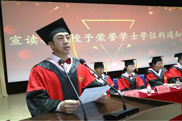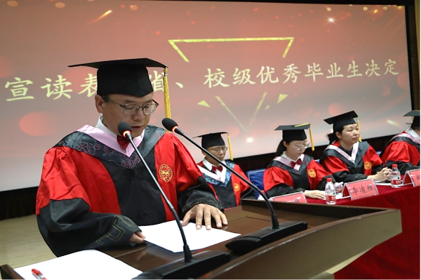 典礼在庄严的国歌奏唱声中开幕。靖鲲鹏宣读本科生毕业决定和本科生学位授予决议;陈晶璞宣读推荐授予宋禹霏等3名2023届毕业生荣誉学士学位文件;张振华宣读省、校级优秀毕业生表彰文件。