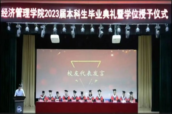 工商管理系主任王玖河作为教师代表发言。他代表全院教师,对毕业生殷殷祝福,希望所有同学步入社会课堂后,要见贤思齐、努力向上,要有学习意识,团队意识,追逐光、靠近光、成为光、散发光,传播燕大经管好声音,在各自人生赛道上奋力书写青春绚丽华章。