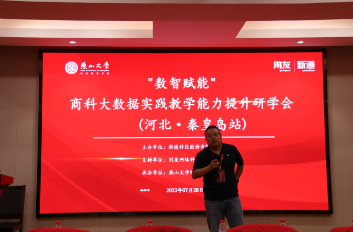 会议闭幕式由新道科技股份有限公司教育规划顾问李贺老师主持,他对数字经济时代下的企业场景、院校课程开设的现状、人才培养目标、课程内容、平台架构、课程特色、专业建设进行了分析和解读。
