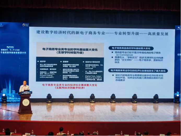 上午主旨报告环节,刘军主任围绕《新时代电子商务本科专业发展的若干思考》主题,指出数字经济进入“新电商”时代,要把握政策导向、社会需求和技术变革,引领电商专业转型升级。