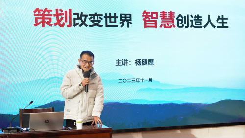 师生带来了一场碰撞思维、启迪心灵的报告。在讲座中,杨健鹰教授以实例入手,通过对成都名片工程宽窄巷子、5·12汶川大地震灾后重建、海南国际旅游岛打造、敦煌国际旅游名城等数十个经典案例策划过程的生动分享,传授了掌握策划、文化创意的实战技巧和思想体系以及提升专业技能的方法,将师生们带进了创新思维的世界。