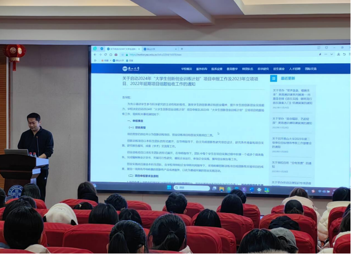于11月30日在经管楼A218学术报告厅大学生创新创业训练计划项目申报动员会。此次动员会旨在鼓励学生积极参与创新创业训练计划,提升实践能力和创新思维。此次活动受到同学们的热烈响应,能容纳120多人的报告厅,有150多名学生参加。