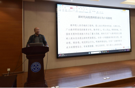 副院长靖鲲鹏解读了教育部印发的《新时代高校教师职业行为十项准则》,并领学了《师德优秀典型先进事迹》、《2019-2023年教育部公开曝光的违反教师职业行为十项准则典型案例》和《违反高校教师职业行为十项准则典型案例》三个重要文件。靖鲲鹏强调,《新时代高校教师职业行为十项准则》是教师职业行为的基本规范,它明确了新时代教师职业规范,针对主要问题、突出基本底线,是对广大教师的警示提醒和严管厚爱,是深化师德师风建设,造就政治素质过硬、业务能力精湛、育人水平高超的高素质教师队伍的关键之举。