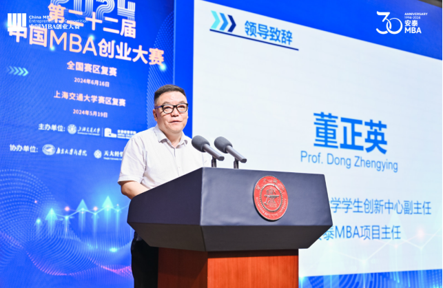 上海交通大学安泰经济与管理学院董正英教授在第二十二届中国MBA创业大赛全国赛复赛上发表致辞,并代表主办方对参赛者表示欢迎。董教授指出,创新创业人才培养是未来的全球趋势,是各国发展的潜在核心竞争力,全球著名的大学都非常注重创新创业教育、实践与孵化。“新质生产力”的核心要素就是科技创新,通过科技创新的交叉融合突破所产生的根本性成果,这也给了以科技创新应用为主导的MBA创业项目更多的发展机遇。董教授希望,所有的参赛者都能展现创业激情与勇气,挖掘内在动力。