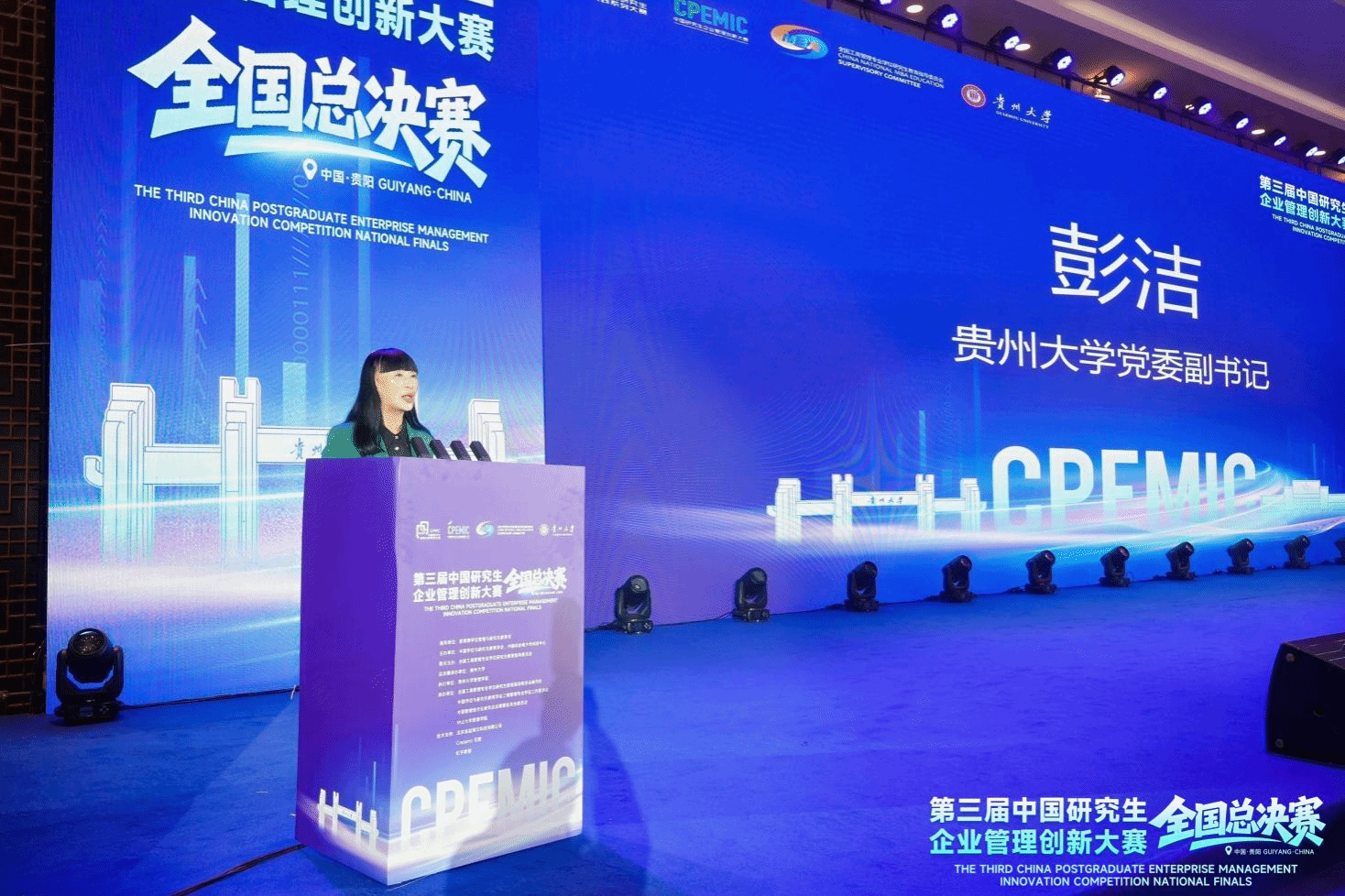 彭洁代表承办单位贵州大学致辞。她表示,学校高度重视本次赛事承办工作,将以赛促建、以赛促改,积极学习全国高校在研究生培养与创新创业教育中的先进经验,持续深化产教融合与校企协同,不断提升管理类学科建设水平和人才培养质量。