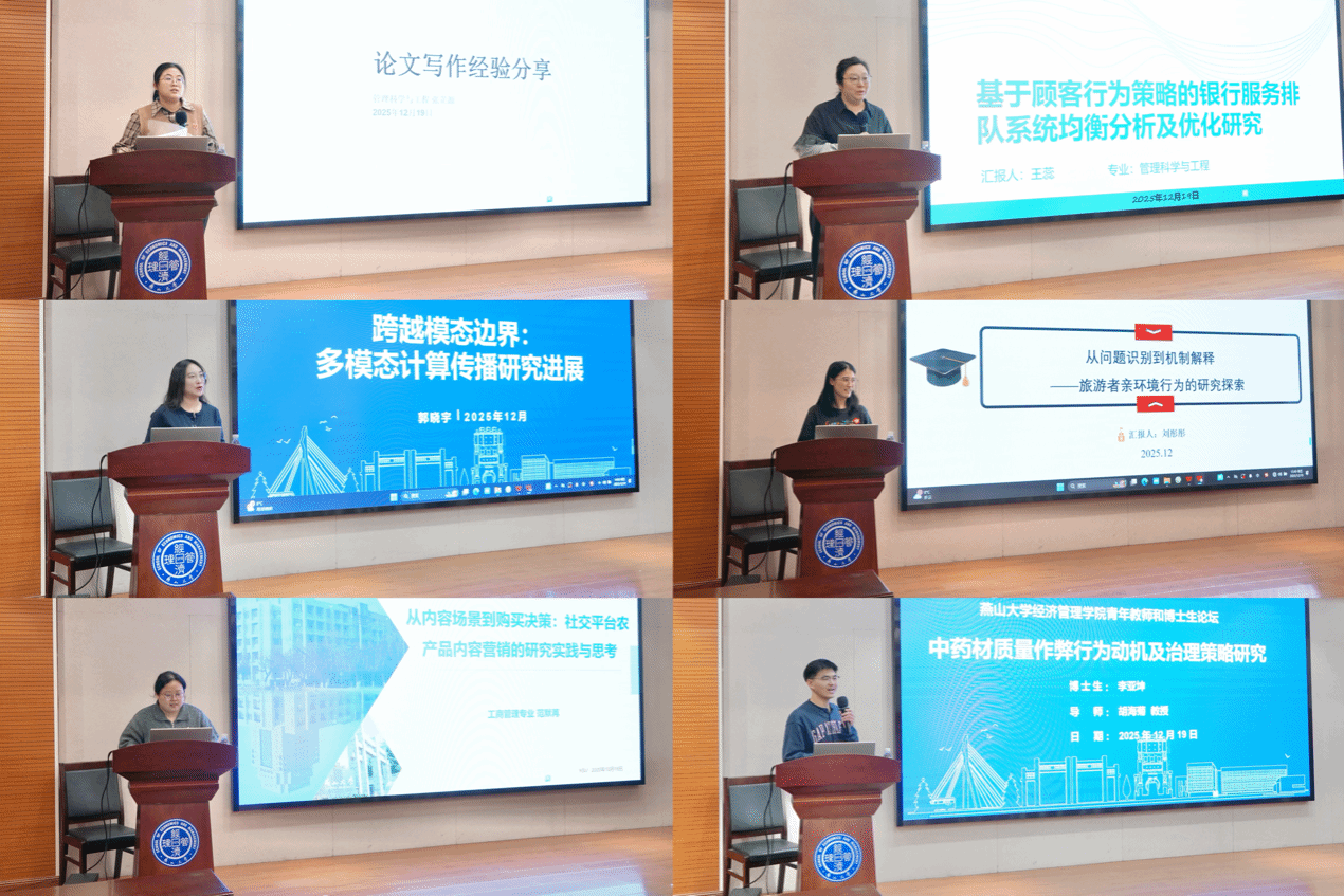 下午的博士生科研汇报环节由张旭、潘宏亮主持,六位博士生各有侧重,分享自身的科研历程与心得体悟。管理科学与工程专业的张芷源、王蕊、郭晓宇,分别以《论文写作经验分享》《基于顾客行为策略的银行服务排队系统均衡分析及优化研究》《跨越模态边界:多模态计算传播研究进展》为题作汇报;工商管理学专业的刘彤彤、范默苒、李亚坤,则依次围绕《从问题识别到机制解释:旅游者亲环境行为的研究探索》《从内容场景到购买决策:社交平台农产品内容营销的研究实践与思考》《中药材质量作弊行为动机及治理策略研究》展开分享。