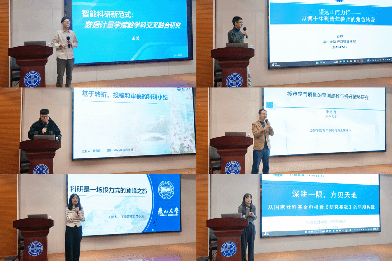 上午的青年教师学术报告环节由李世勇、刘伟岩、张敬伟主持,六位青年教师带来了兼具深度与广度的学术分享。电子商务系王旭以《智能科研新范式:数据计量学赋能学科交叉融合研究》为题,系统阐释了计量学的理论并剖析了该理论在多学科交叉融合研究中的应用;工业工程系邵帅以《望远山而力行——从博士生到青年教师的角色转变》为题,分享了身份转换过程中的感悟与成长;经济系黄永健以《基于转折、投稿和审稿的科研小结》为题,凝练了宝贵的科研实战经验;会计系李冉冉以《城市空气质量的预测建模与提升策略研究》为题,分享了自己多年深耕的研究课题;工商管理系丁小洲以《科研是一场接力式的登峰之旅》为题,分享了自身丰富的投稿经历;旅游管理系潘越以《深耕一隅,方见天地:从国家社科基金申报看研究基础的早期构建》为题,深入剖析了研究基础早期构建的关键要点。