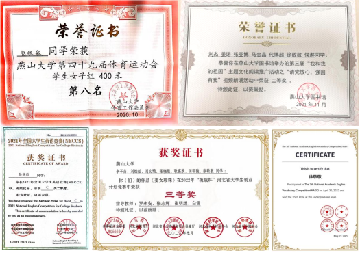 徐敬敬始终追求多维发展,积极参加各项学科竞赛,并取得了优异成绩。她在全国大学生英语竞赛、全国大学生学术英语竞赛、“挑战杯”河北省大学生创业计划竞赛、“挑战杯”河北省大学生创业计划竞赛、互联网+等竞赛中均有斩获奖项。截至目前,累计获得20余项校级及以上奖项。