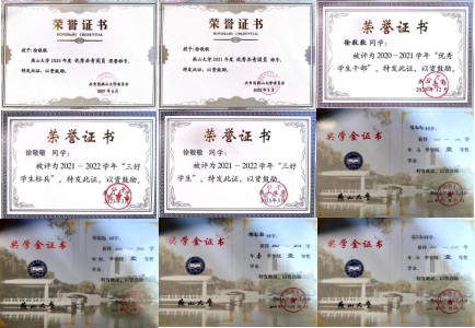 对待学习,徐敬敬始终保持积极进取的态度,勤奋刻苦,脚踏实地。她学习成绩优异,学业平均绩点3.972,位列专业第一。她连续三个学期的绩点在4.0以上,连续四个学期综合测评成绩突破100分,42门课程获得A及以上成绩。