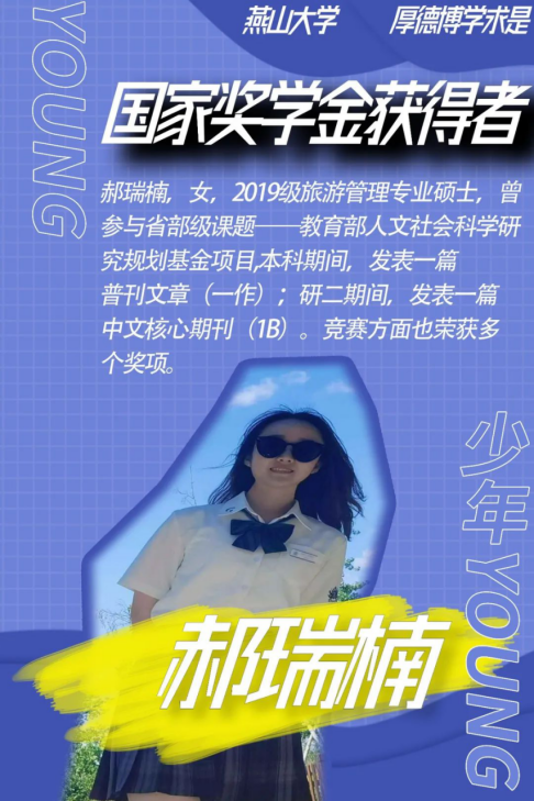 她无论是在生活和学业上都有着不俗的成绩。在科研学习上,曾参与省部级课题——教育部人文社会科学研究规划基金项目“高铁条件下京津冀区域旅游效率分析及协同提升路径研究”,本科期间,发表一篇普刊文章(一作);研二期间,发表一篇中文核心期刊(1B)。竞赛方面也荣获多项奖状:2020-2021年硕士研究生国家奖学金、第三届全国大学生旅游设计大赛二等奖、全国大学生金融精英挑战赛优秀奖、哔咔漫画