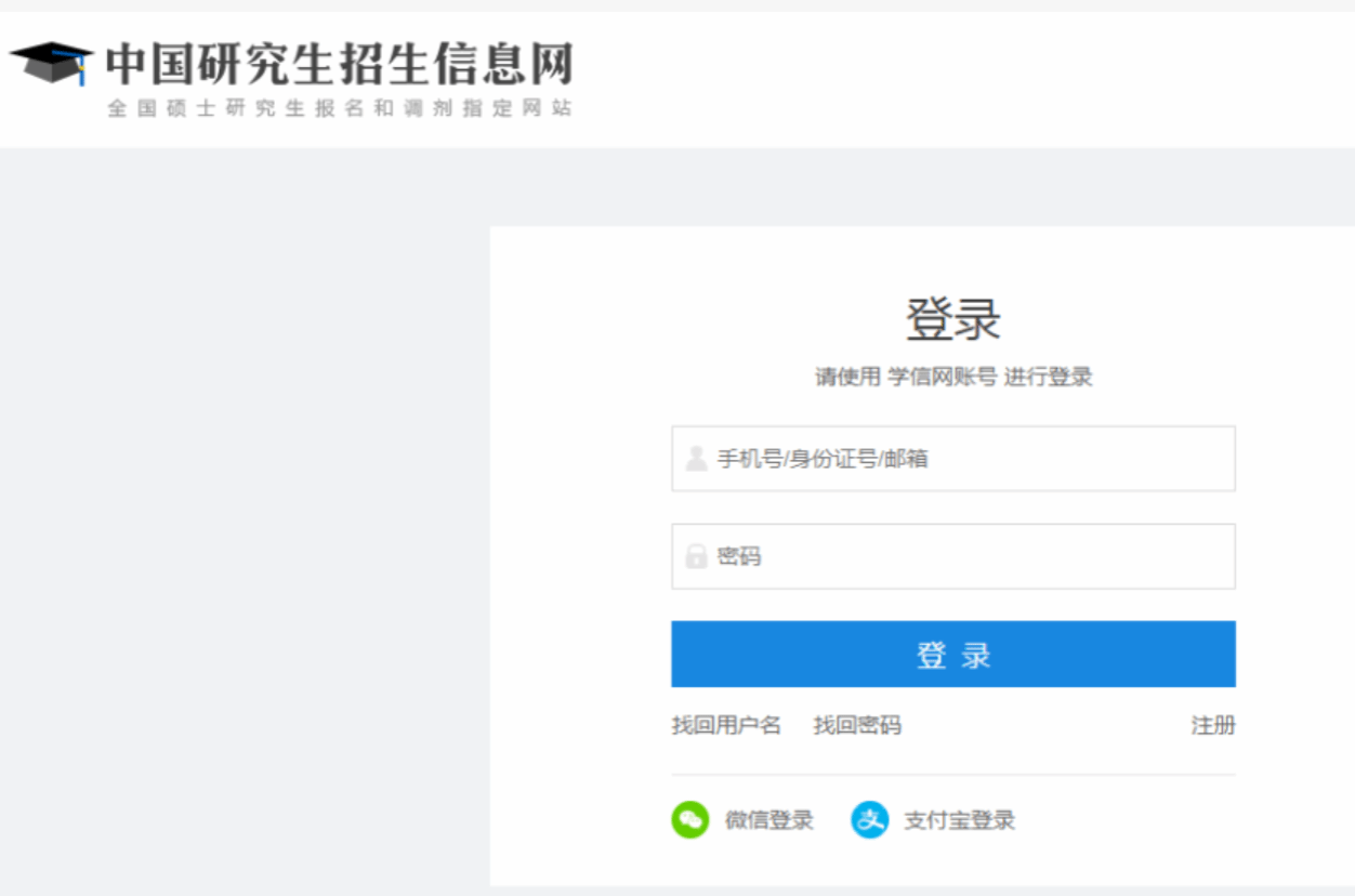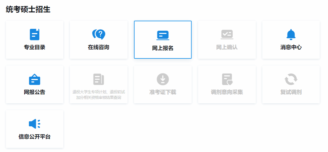 全国硕士研究生招生考试报名包括网上报名和网上确认两个阶段。所有考生均须在规定时间登录“中国研究生招生信息网”(简称“研招网”)(//yz.chsi.com.cn)填报网上报名信息、网上支付报考费,并按照所选报考点要求进行网上确认。只有完成以上步骤,报名流程才完成。